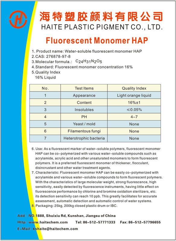 HAPNQ เป็นของเหลวสีน้ำตาลความเข้มข้น 16% และน้ำ 84%เมื่อใช้ในระบบน้ำอุตสาหกรรมสัญญาณเรืองแสงของโพลีเมอร์ที่ติดแท็กนี้สามารถใช้เพื่อระบุจำนวนโพลีเมอร์ที่ติดแท็กที่มีอยู่ในระบบน้ำอุตสาหกรรม